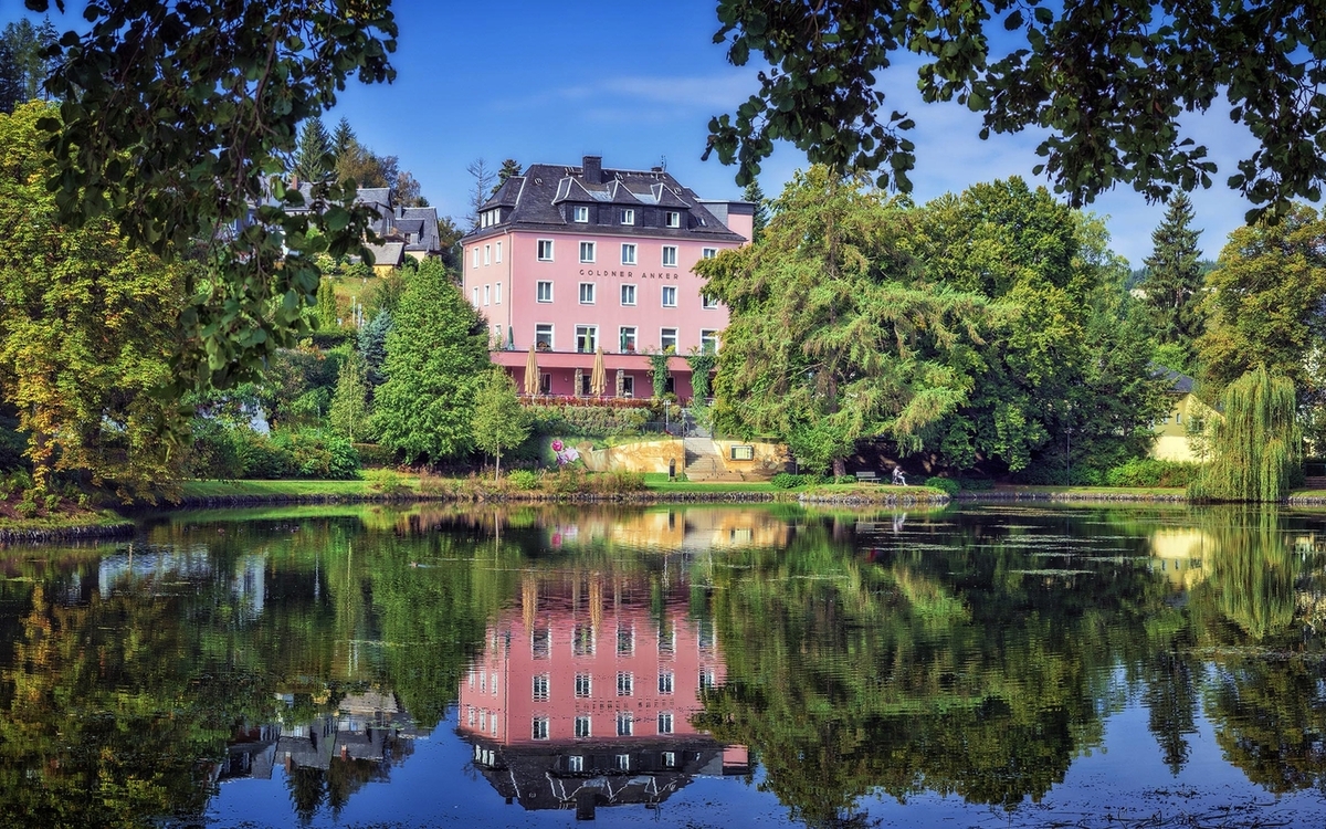 Das familiengeführte Hotel Goldner Anker liegt in exponierter Lage direkt am Ufer des malerischen Louisa-Sees in Bad Elster und ca. 800 Meter vom historischen Albert Bad und der Soletherme und Saunawelt Bad Elster entfernt.