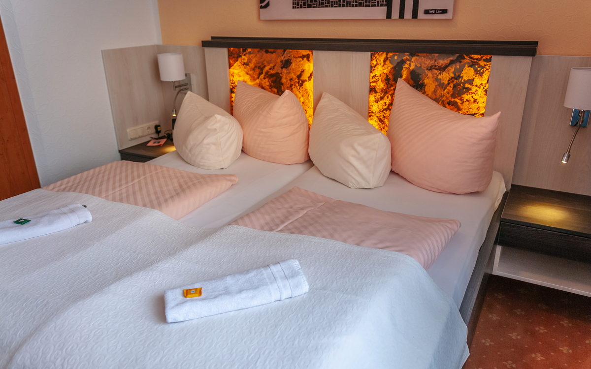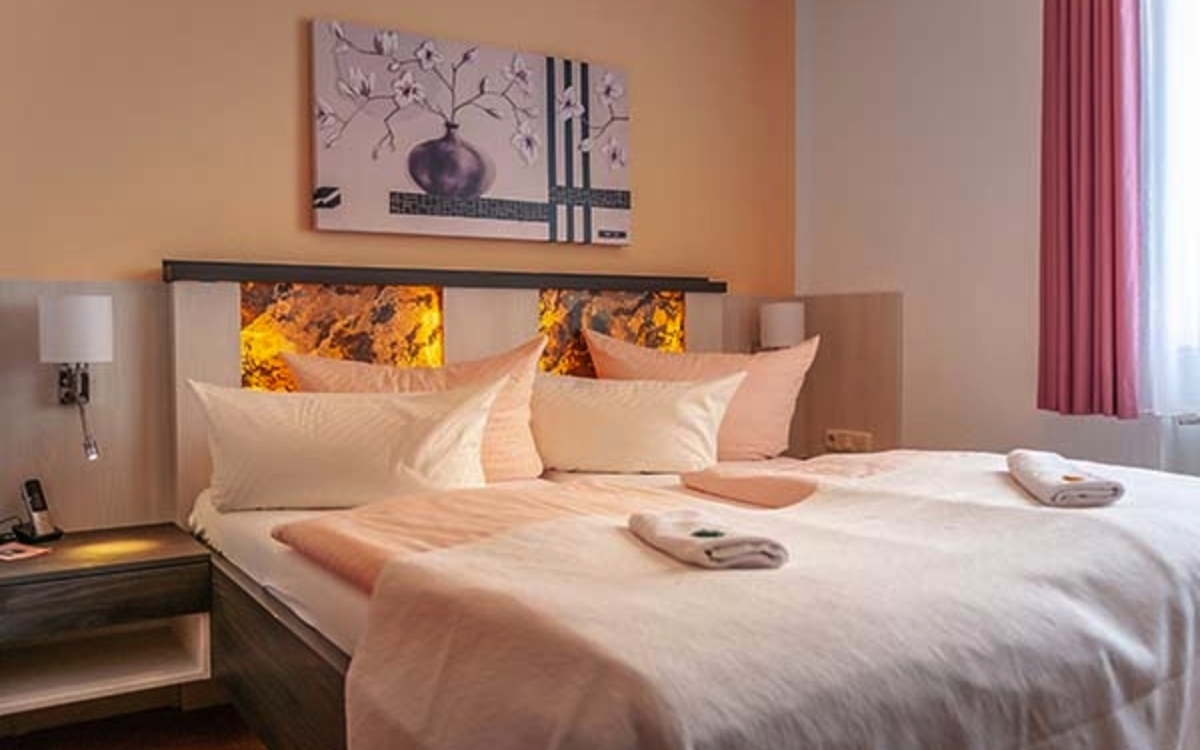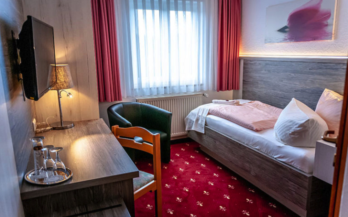 Alle 20 Zimmer des Hotels sind komfortabel mit Dusche/WC, Föhn, Leihbademantel, Durchwahl-Telefon, Sat.-TV, kostenfreiem Internetzugang (WLAN) und Minibar ausgestattet.