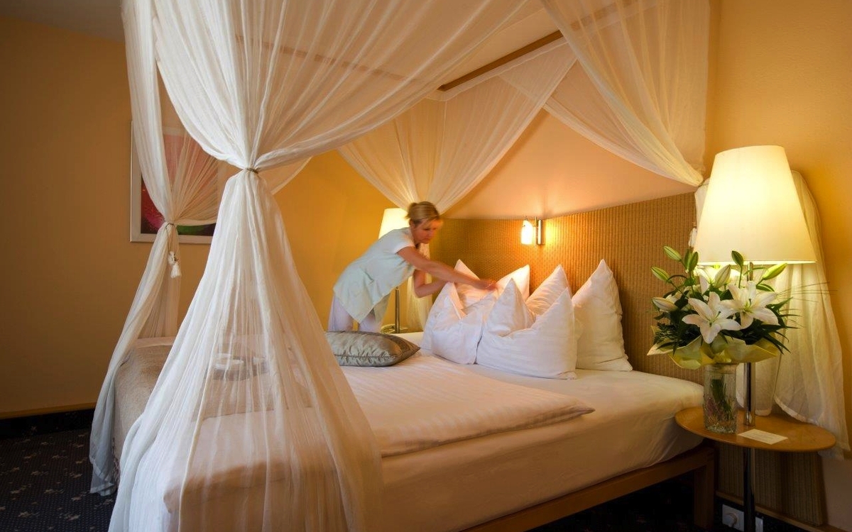 Das Standard Doppelzimmer verfügt neben der nötigen Ausstattung für Ihren Kur-Urlaub auch einen kleinen Balkon, mit Blick zur Eingangs- und Parkseite. Blick zur Poolseite gg. Aufzahlung möglich.