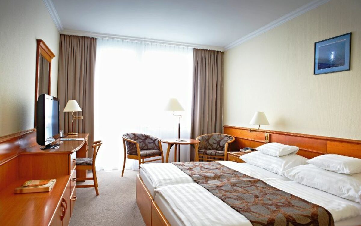 Alle klimatisierten Standardzimmer (ca. 22 m²) sind mit Bad oder Dusche/WC, Fön, Leihbademantel, TV, Telefon, kostenfreiem Internetzugang (WLAN), Minibar, Safe und Balkon ausgestattet. Gegen Aufpreis können Sie auch die modernisierten Superior Doppelzimmer (ca. 25 m²) oder Deluxe-Zimmer (ca. 20 m²) mit Gesundheitsmatratzen buchen. Einzelzimmer sind Doppelzimmer zur Alleinbenutzung. Das Hotel ist darüber hinaus u.a. mit einer 24-Stunden-Rezeption, mehreren Liften und kostenfreiem Internetzugang (WLAN) im Lobby-Bereich ausgestattet.
