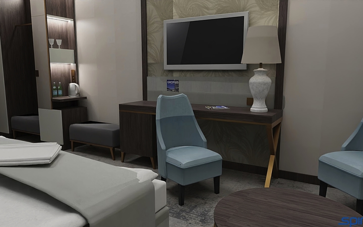 Das Penthouse liegt zur Seeseite hin und besitzt eine eigene Terrasse. Es umfasst zudem zwei separate Schlafzimmern und ein Wohnzimmer mit Bar. Mit einem privaten Aufzug gelangt man in die Räumlichkeiten.