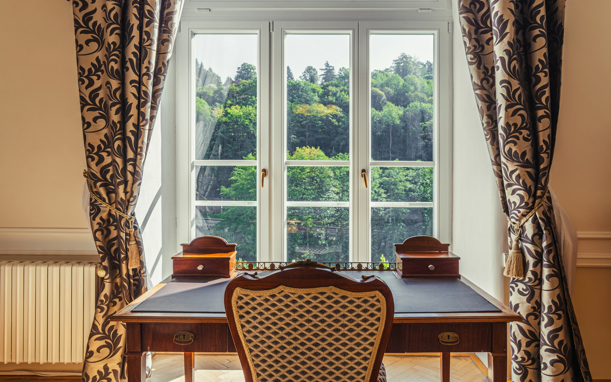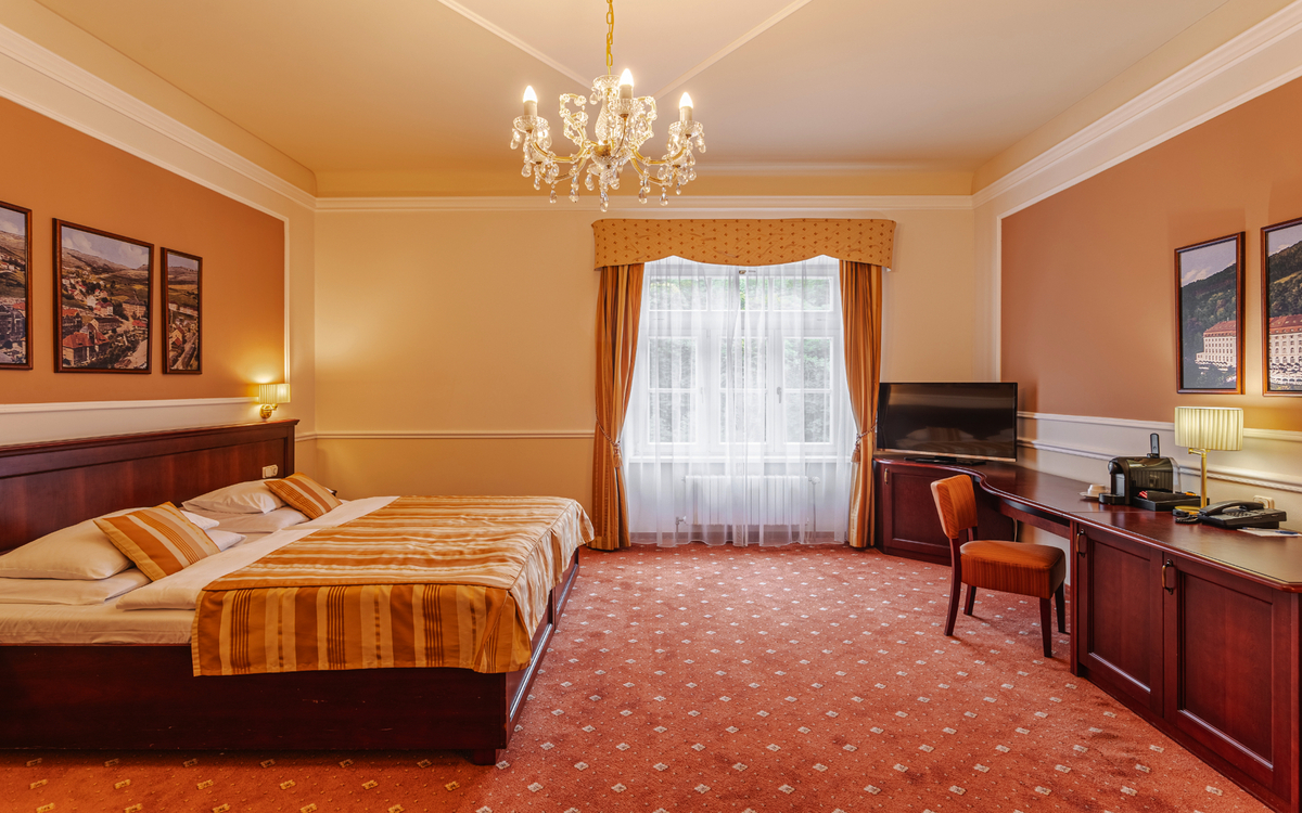 Komfortabel eingerichtetes und geräumiges Zimmer mit Blick auf das umliegende Tal und erweiterten Leistungen im gastronomischen Bereich.