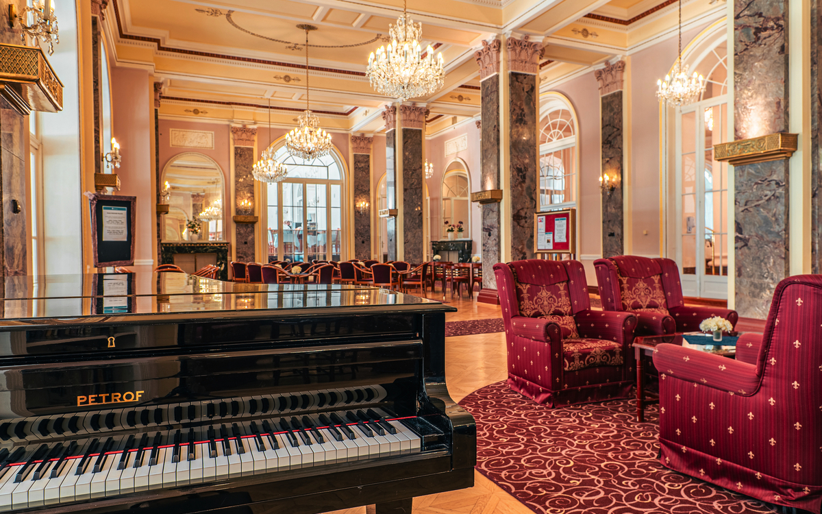 Das Kurhotel Radium Palace liegt inmitten eines weitläufigen Waldparks und scheint zwischen den Bäumen wie eine wunderschöne Perlenkette hervor. Fußläufig erreichen Sie das Wellnesszentrum und eine Bushaltestelle.