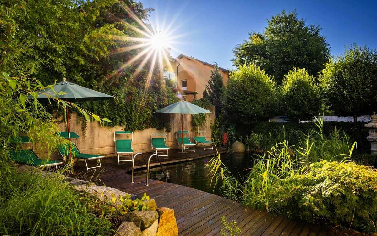 Das Wellness- und Gesundheitshotel verfügt über ein eigenes Thermal-Bewegungsbecken (5 x 12 m, ca. 31°C) und einen Whirlpool (ca. 36°C), die mit dem original Bad Füssinger Heilwasser aus der Ursprungsquelle der THERME EINS gefüllt sind. Zudem steht Ihnen ein kleiner Saunabereich mit finnischer Sauna, Dampfbad und Infrarotkabine zur Verfügung. Zur Abkühlung empfiehlt sich ein Gang in die Erlebnisdusche oder ein Sprung in den Naturschwimmteich im Garten. Weitere Erholung versprechen die Hotel-Liegewiese, der Garten und die Schwimmbad-Terrasse des Hotels. Für den sportlichen Ausgleich gibt es im Hotel einen Fitnessbereich sowie wechselnde Entspannungs- und Bewegungsprogramme, wie Yoga, Zen Meditation und Nordic Walking.